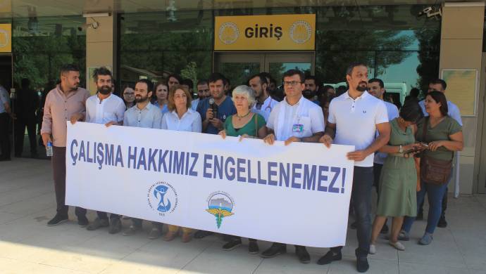 Sağlık örgütleri adına açıklama yapan Diyarbakır Tabip Odası Asistan Hekim Komisyonu Üyesi Mustafa Mesut Kaya, uzman hekim unvanı alan 4 meslektaşlarının güvenlik soruşturması gerekçe gösterilerek hukuksuz bir şekilde mesleklerinden uzak bırakıldıklarını belirterek, arkadaşlarının herhangi bir dava veya soruşturması olmaksızın unvan değişikliği nedeniyle güvenlik soruşturmasına alındığını ifade etti.