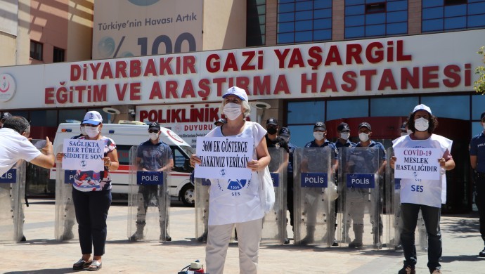 Sağlık ve Sosyal Hizmet Emekçileri Sendikası (SES) Diyarbakır Şubesi üyeleri, zor çalışma koşullarına dikkati çekmek ve adil ücret talebiyle Gazi Yaşargil Eğitim ve Araştırma Hastanesi’nde bir saatlik iş bırakma ve oturma eylemi gerçekleştirdi.