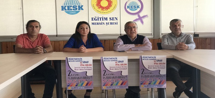 Eğitim ve Bilim Emekçileri Sendikası (Eğitim Sen) Mersin Şubesi, Eğitim İş, Hürriyetçi Eğitim Sen TEÇ-SEN, Anadolu Eğitim Sen, Özgür Eğitim Sen, Eğitim Hak-Sen, Eksen Eğitim-Sen, İdeal Eğitim Sen, Eğitim Söz Sen, Eğitimde Birlik Sen, Eşit Haklar Sendikası, Öğretmenlik Meslek Kanunu’nun iptal edilmesi ve 2 Kasım’da yapacakları iş bırakma eylemine ilişkin Eğitim Sen Mersin Şube binasında ortak basın toplantısı düzenledi.