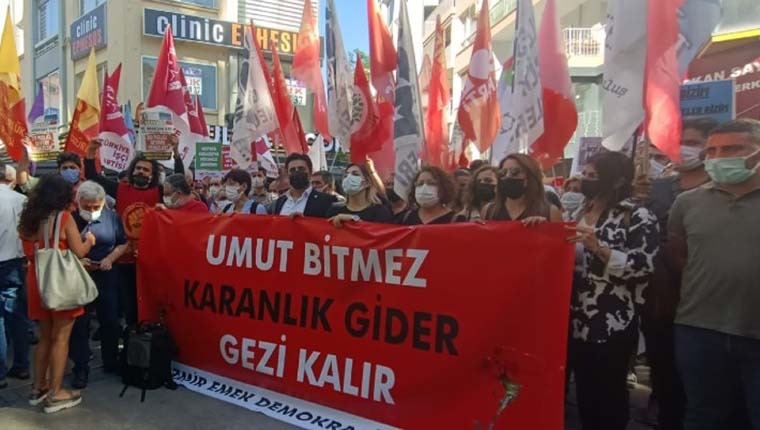 “Umut bitmez karanlık gider, gezi kalır” yazılı pankartının açıldığı eylemin metnini DİSK Ege Bölge Temsilcisi Memiş Sarı okudu. Gezi direnişini hatırlatan Sarı, Gezi ruhunun bugün ülkenin birçok noktasında devam eden direnişte olduğunu kaydetti.