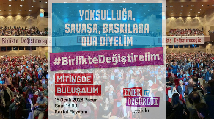 Emek ve Özgürlük İttifakı, 15 Ocak Pazar günü saat 13.00’te İstanbul Kartal Meydanı’nda “Yoksulluğa, Savaşa, Baskılara Dur Diyelim, Birlikte Değiştirelim” şiarıyla miting düzenleyeceğini duyurdu.