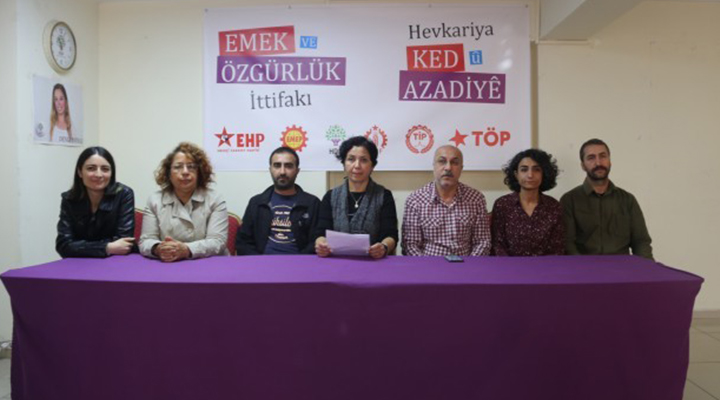Emek ve Özgürlük İttifakı, 3 Aralık’ta İzmir’de yapacağı halk buluşmasına çağrı amacıyla Halkların Demokratik Partisi (HDP) İzmir il binasında basın toplantısı düzenledi. İttifak bileşenlerinin temsilcilerinin katıldığı toplantıda basın metnini Türkiye İşçi Partisi İzmir İl Yöneticisi Zübeyde Gülhan okudu.