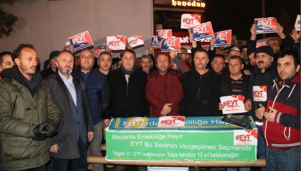 DHA’dan Tezcan Solmaz’ın haberine göre, EYT mağdurları üzerine ‘Mezarda emekli olmak istemiyoruz’ yazısı koydukları tabutla bir banka şubesi önüne gelerek temsili olarak emekli olmadan hayatını kaybeden bir kişinin emekli maaşını çekti. Seçimlerde kendilerinin sorunlarını dile getiren siyasilere destek vereceklerini belirterek yanlarında temsili bir seçim sandığı da taşıyan grup adına konuşan Mehmet Ali Çelik, “Emekli olmak ve yasal haklarımızı istiyoruz. Bizler yaşa takılanlar olarak emekli olmak istiyoruz” dedi.