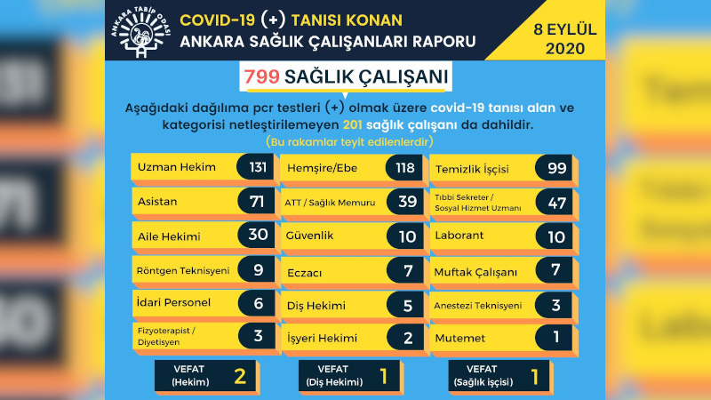 Ankara Tabip Odası tarafından yapılan açıklamada, “08 Eylül 2020 tarihi itibariyle, Ankara Tabip Odası Yönetim Kurulu tarafından ulaşılan ve teyit edilen Covid-19 (+) tanısı alan sağlık çalışanlarının sayısının 799’a yükseldiği bildirildi” denildi.