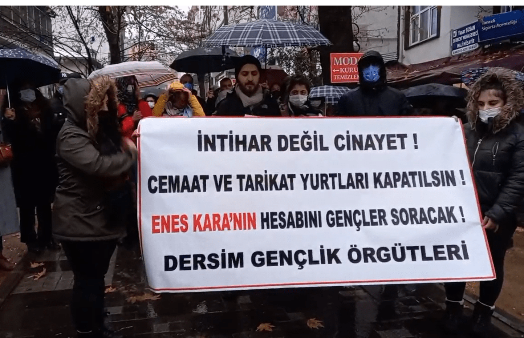 “20 yaşında Fırat Üniversitesi Tıp Fakültesi öğrencisi arkadaşımız Enes Kara gelecek kaygısından, ülkenin durumundan, kaldığı cemaat yurdunda ki baskılardan dolayı yaşamına son verdi. Cemaat yurtları, dinci gericiliğin gençlerin hayatını karartmak için kazdığı bir çukurdur.” İfadeleriyle başlayan açıklamada, “Enes intihar etmemiştir, Enes bu karanlık çukura düzenin tamamının elleriyle itilmiştir. Öfkeyle izlediğimiz son videosunda failleri anlatıyor: Gericilik, geleceksizlik, ümitsizlik…” denildi.