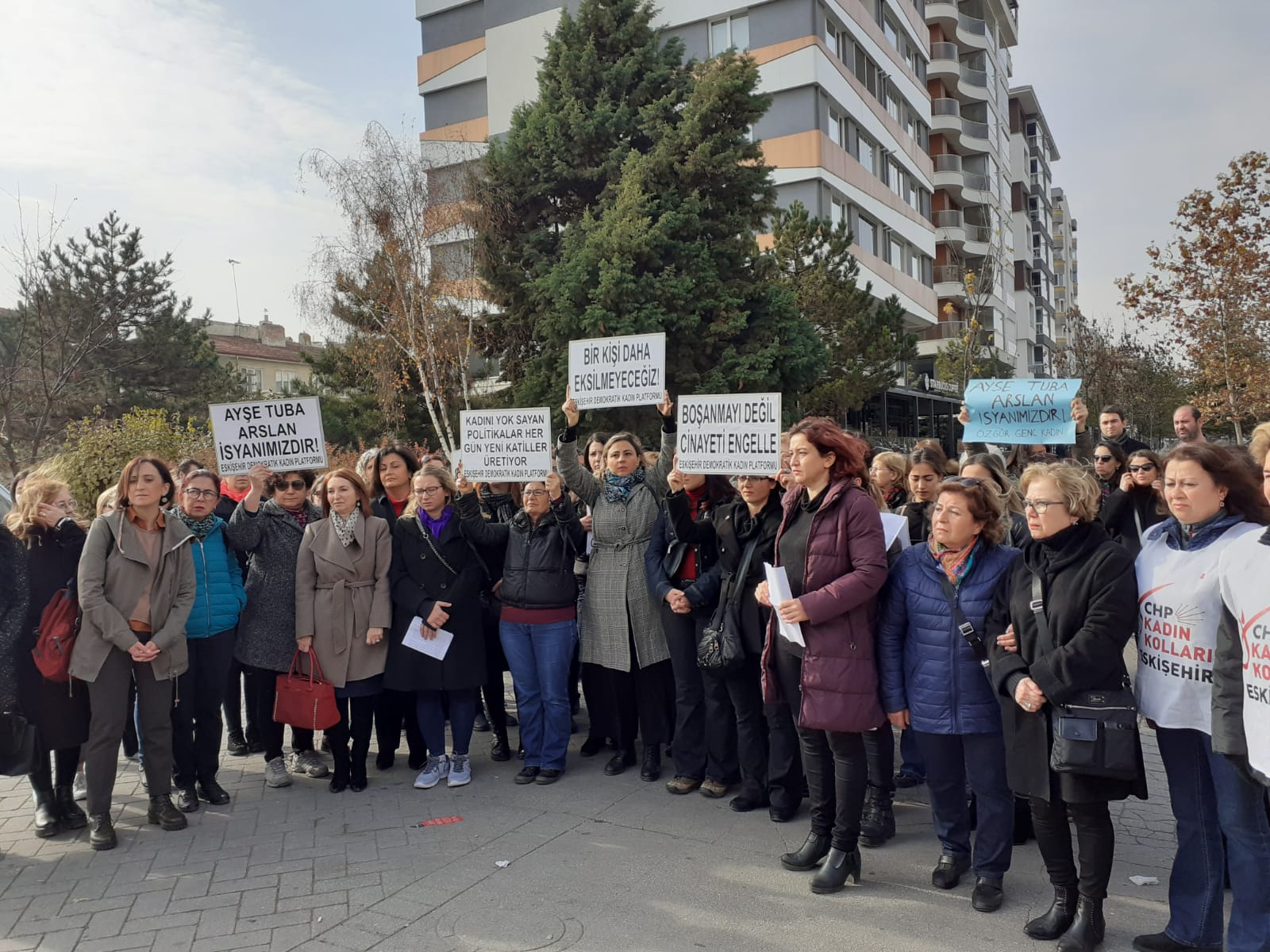 Cenaze töreni öncesi Ayşe Tuba Arslan için Eskişehir Demokratik Kadın Platformu(EDKP) cami karşısında bir açıklama yaptı. Yapılan açıklamada; “ İstatistiklere göre her 3 kadından biri şiddete uğruyor… Her gün bir kadın arkadaşımızı kadın cinayetinde kaybediyoruz. Devlet ise buna çözüm bulmak yerine kadınlar yıllardır mücadele vererek kazandığı haklarını bir bir ellerinden almaya çalışıyor. Ve bunu müjde olarak sunuyor. Yargı paketiyle toplum için faydalı düzenlemeler yapıyoruz diyor. Bakin bu yargı paketinde neler var.” İfadelerine yer verdi.