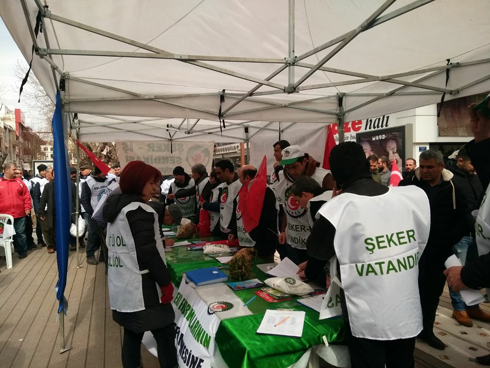 Sendikalı işçiler, basın açıklaması gerçekleştirmeden önce, Eskişehir halkını özelleştirmelere karşı, “Şeker Fabrikalarının Özelleştirilmemesine Bir İmza da Sen At” şiarıyla başlattıkları, 28 Şubat’tan bu yana toplamaya devam ettikleri imza kampanyasına destek vermeye çağırdı.