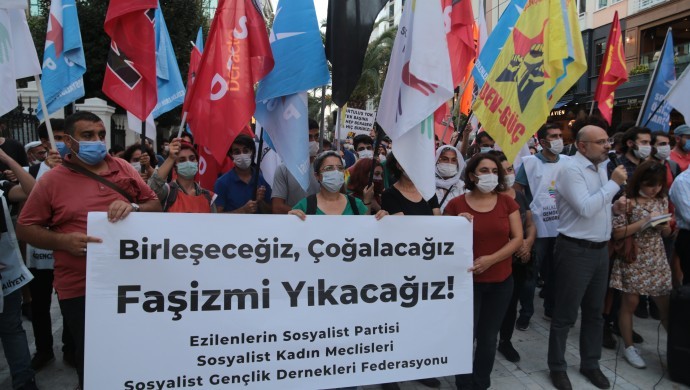 “Birleşeceğiz, çoğalacağız faşizmi yıkacağız” pankartının açıldığı eylemde kitle sık sık “Yaşasın birleşik mücadelemiz”, “Faşizme karşı omuz omuza”, sloganları atıldı.