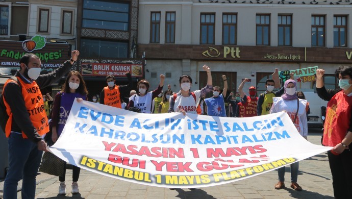 İstanbul 1 Mayıs Platformu, Fatih ilçesine bağlı Sirkeci’deki PTT binası önünde 1 Mayıs İşçi Bayramı’nı kutladı. Bazı siyasi parti, sendika ve sivil toplum örgütü temsilcileri kutlamaya katıldı. Koronavirüs (Kovid-19) salgınından kaynaklı fiziki mesafenin korunduğu kutlamada, üzerinde “Evde açlık, işte salgın, kahrolsun kapitalizm” yazılı pankart açıldı. Kutlamada sık sık, “Direne direne kazanacağız”, “Bîjî Yek Gulan” ve “ Yaşasın 1 Mayıs” sloganları atıldı.