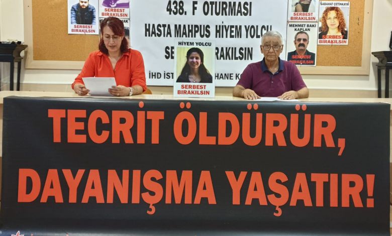 Bu haftaki açıklamada basın metnini İHD Hapishane Komisyonu adına Meral Nergiz Şahin ve Mehmet Acettin okudu. Müebbet hapis cezası alan, 16 yıldır hapiste tutulan Hiyem Yolcu’nun 2019 Mart-Mayıs ayları arasında tecride karşı destek amaçlı açlık grevi yaptığı hatırlatılan açıklamada, sonrasında bacaklarında kaşıntılı yaraların arttığı, kandaki lökosit değerinin normalin altına düştüğünün tespit edildiği ancak pandemi sürecine girildiği gerekçesiyle Yolcu’nun hastaneye götürülmediği, tetkiklerinin yarım kaldığı ve hastalığına teşhis konulamadığı kaydedildi.