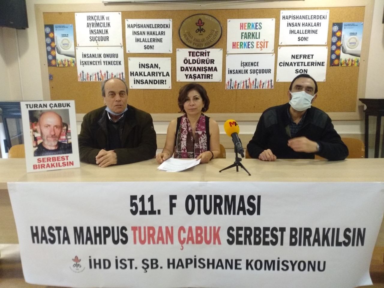 İnsan Hakları Derneği (İHD) İstanbul Şubesi Hapishaneler Komisyonu, hasta tutukluların durumuna dikkat çekmek için her hafta yaptığı “F Oturumu” eyleminin 511’incisini Taksim’de bulunan dernek binalarında yaptı. Bu hafta Metris 2 Nolu T Tipi Kapalı Hapishanesi’nde tutuklu bulunan ve 4’üncü evre kanser hastası olan ağır hasta tutuklu Turan Çabuk’un durumuna dikkat çekildi.