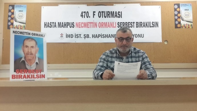 İnsan Hakları Derneği (İHD) İstanbul Şubesi Hapishane Komisyonu, hasta tutukluların durumuna dikkati çekmek için yaptığı, “F Oturumu” eyleminin 470’incisini salgın nedeniyle sosyal medya hesabı üzerinden gerçekleştirdi. Bu haftaki oturum da Şırnak T Tipi Kapalı Hapishanesi’nde tutulan ağır hasta tutuklu Necmettin Ormanlı’nın durumu ele alındı. Açıklamayı İHD üyesi Yüksel Uygun okudu.