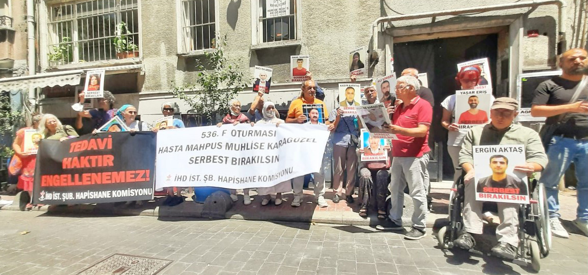İnsan Hakları Derneği (İHD) İstanbul Şubesi Hapishaneler Komisyonu, hasta tutsakların durumuna dikkat çekmek için her hafta düzenledikleri “F Oturumu”nun 536’ncısını dernek binalarının önünde gerçekleştirdi. Bu haftaki eylemde, Kayseri Bünyan Kadın Kapalı Hapishanesi’nde tutulan üç defa kalp krizi geçiren kalp, diyabet, hipertansiyon, astım, bel ve boyun fıtığı hastası olan 60 yaşındaki ağır hasta tutsak Muhlise Karagüzel’in durumuna dikkat çekildi.