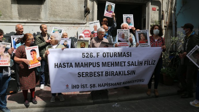 İnsan Hakları Derneği (İHD) İstanbul Şubesi Hapishaneler Komisyonu, hasta tutukluların durumuna dikkat çekmek için her hafta düzenledikleri “F Oturumu” eyleminin 526’ncısını dernek binası önünde düzenledi. “526 F Oturması haftası Mehmet Salih Filiz serbest bırakılsın” pankartı açıldı. Eylemin bu haftasında Bodrum S Tipi Kapalı Hapishanesi’nde tutulan hasta tutkulu Mehmet Salih Filiz’in sağlık durumuna dikkat çekildi.