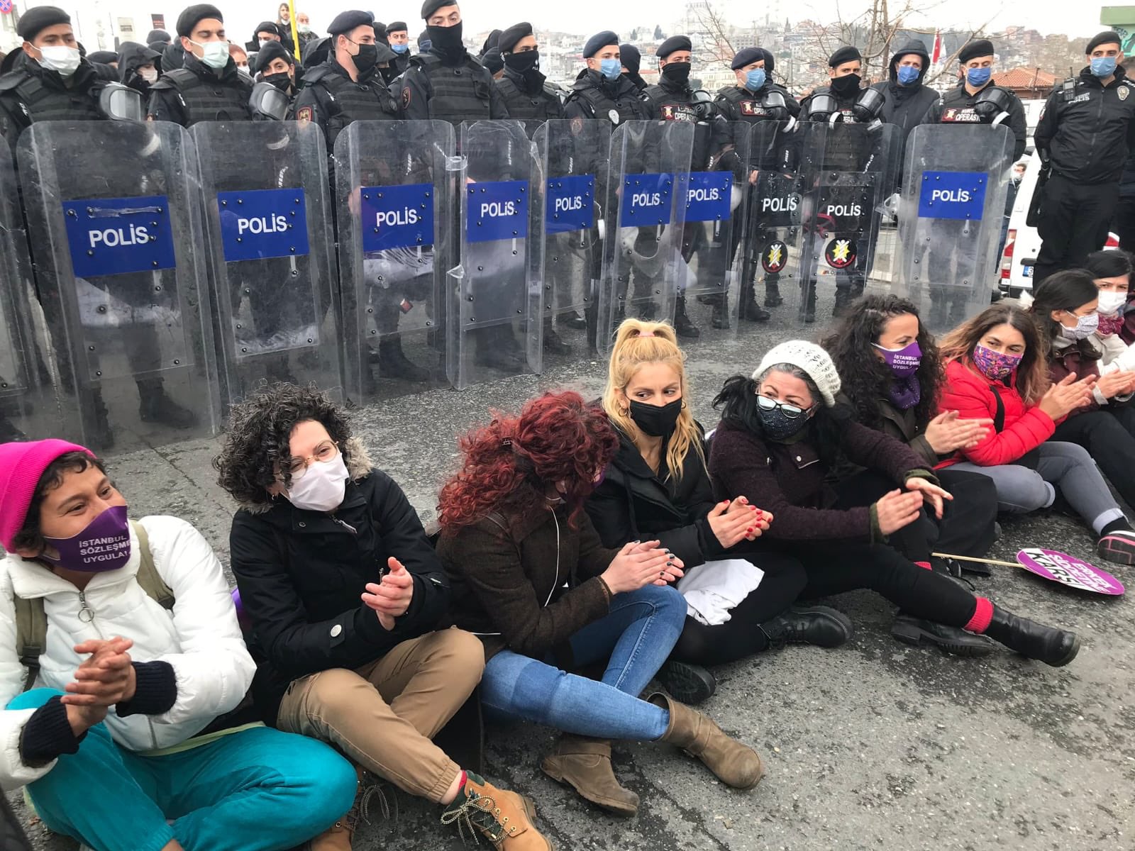 Kadınlar daha sonra polis engeline karşı Galata Köprüsü üzerinde oturma eylemine geçti. Polis çemberinde dakikalarca slogan atan kadınlar, tepkilerini attıkları slogan, çektikleri zılgıt ve söyledikleri şarkılar ile dile getirdi. Kadınlar, “İstanbul Sözleşmesi uygulansın, karar geri çekilsin. İstanbul Sözleşmesi’nin feshedilmesinin tek amacı aile içindeki şiddet kaynağını korumaktır. İstanbul Sözleşmesinden de haklarımızdan da vazgeçmiyoruz” dedi.