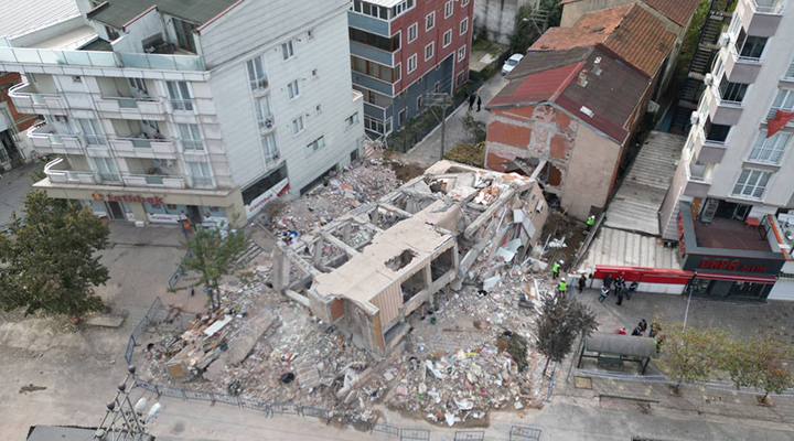 Yıkımın yaşandığı Arslan Apartmanı’nın enkazı ve mühürlenen 12 binanın bulunduğu bölge, dronla görüntülendi. Bölgede bir süredir devam eden metro hattı çalışmasının olduğu görüldü. Metro çalışması nedeniyle açılan kuyu da dron görüntülerine yansıdı.