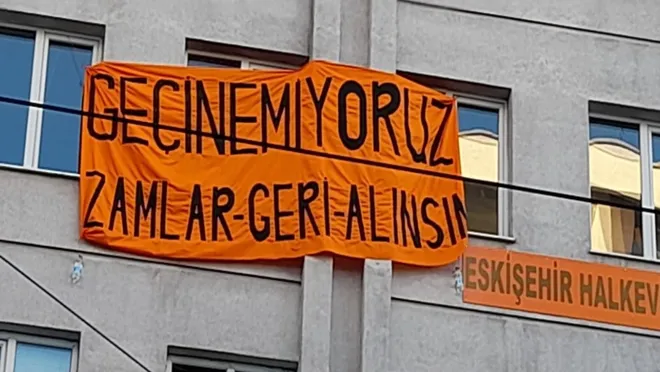 Eskişehir Halkevi’ne asılan ‘Geçinemiyoruz, Zamlar Geri Alınsın’ pankartı, asılmasının üzerinden 45 dakika geçmesinin ardından Eskişehir Emniyet Müdürlüğü’nden valilik genelgesi gerekçe gösterilerek gece yarısı indirilmişti. Şube binalarına yeniden aynı pankartı asan Halkevi üyelerine Eskişehir Emniyet Müdürlüğü tarafından yasada belirlenen en üst sınır olan 18 bin lira idari para cezası tebliğ edildi. (Anka)