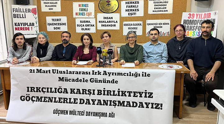 Göçmen Mülteci Dayanışma Ağı, 21 Mart Uluslararası Irk Ayrımcılığı ile Mücadele Günü kapsamında Beyoğlu’nda bulunan İnsan Hakları Derneği (İHD) İstanbul Şubesi binasında basın toplantısı düzenledi. Basın metnini İHD Göçmen Mülteci Dayanışma Ağı üyesi Ruken Kalın okudu.