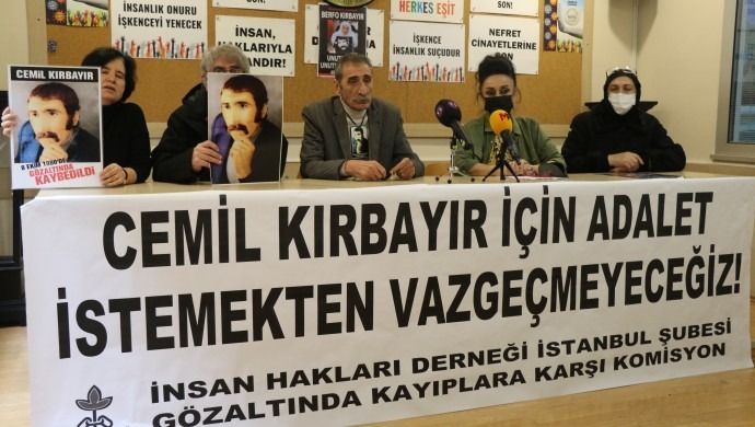 Gözaltında kaybedilen Cemil Kırbayır’ın ailesi ve avukatları, dosyasının zaman aşımına uğramasına ilişkin İnsan Hakları Derneği (İHD) İstanbul Şubesi’nde basın açıklaması gerçekleştirdi. Açıklamaya İHD Eş Genel Başkanı Eren Keskin, Cemil’in abisi Mikail Kırbayır, kardeşi Fatma Kırbayır, kayıp yakını Faruk Eren ve İHD İstanbul Şubesi Gözaltında Kayıplara Karşı Komisyon üyesi Sebla Arcan katıldı. Açıklamada, “Cemil Kırbayır için adalet istemekten vazgeçmeyeceğiz” pankartı açıldı.