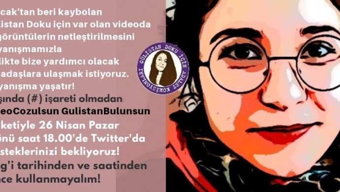 Rosa Kadın Derneği, kaybolmasının üzerinden 133 gün geçen ve koronavirüs nedeniyle arama çalışmaları yavaşlatılan Munzur Üniversitesi öğrencisi Gülistan Doku’nun bulunması talebiyle bu akşam saat 21.00’de twitterda “VideoCozulsun GulistanBulunsun” etiketiyle hastag açacak.