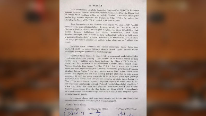 Baro Başkanı Aydın ve diğer avukatların yaşananlara ilişkin tuttuğu tutanak ise hakim tarafından dosyaya konulmadı.