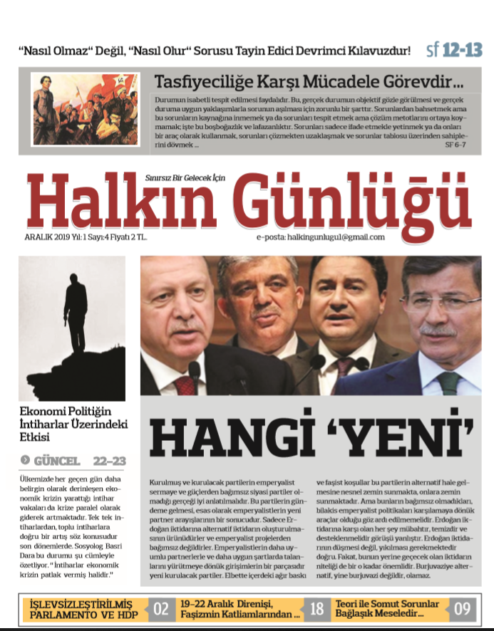 “Sınırsız Bir Gelecek İçin” şiarıyla aylık olarak çıkan Halkın Günlüğü gazetesinin 4. sayısı bugün çıktı “Hangi ‘Yeni’” manşetiyle çıkan Halkın Günlüğü gazetesine irtibat büroları üzerinden ulaşabilirsiniz.