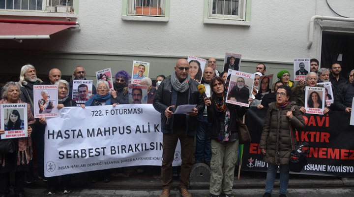 İnsan Hakları Derneği (İHD) İstanbul Şubesi Hapishane Komisyonu, hasta tutsaklar için düzenlediği “F Oturması” eyleminin 722’incisini dernek binası önünde gerçekleştirdi. Bu hafta Ankara Sincan 2 No’lu F Tipi Hapishanesi’nde tutulan hasta tutsak Ali Kılıç’ın durumuna dikkat çekildi. Çok sayıda hak savunucusunun katıldığı eylemde, “Tedavi haktır engellenemez” ve “Hasta mahpus Ali Kılıç serbest bırakılsın” pankartı taşınarak, “Ali Kılıç serbest bırakılsın”, “Tecrit öldürür dayanışma yaşatır” ve “İnsanlık onuru işkenceyi yenecek” sloganları atıldı. Açıklamayı komisyon üyesi Taylan Bekin okudu.