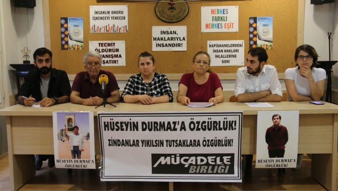 Mücadele Birliği, Kırıklar 2 No’lu F Tipi Hapishanesi’nde bulunan ağır hasta tutuklu Hüseyin Durmaz’ın durumuna ilişkin İnsan Hakları Derneği (İHD) İstanbul Şubesi’nde basın toplantısı düzenledi. Açıklamanın yapıldığı salona, “Hüseyin Durmaz’a özgürlük, zindanlar yıkısın tutsaklara özgürlük” pankartı ve Hüseyin Durmaz’ın fotoğrafları açıldı. Tutuklularla Dayanışma İnisiyatifi (TDİ) ve İHD’nin destek verdiği açıklamaya Durmaz’ın kardeşi Şerife Taşkın katıldı.