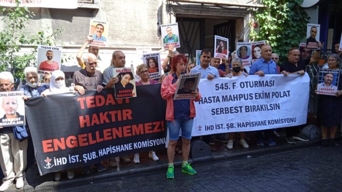 İnsan Hakları Derneği (İHD) İstanbul Şubesi Hapishane Komisyonu, hasta tutukluların durumuna dikkat çektikleri “F Oturumu” eyleminin 545’incisini gerçekleştirdi. Dernek binası önünde yapılan bu haftaki eylemde, Denizli T Tipi Cezaevi’nde tutuklu olan hasta tutuklu Ekim Polat’ın durumuna dikkat çekildi.