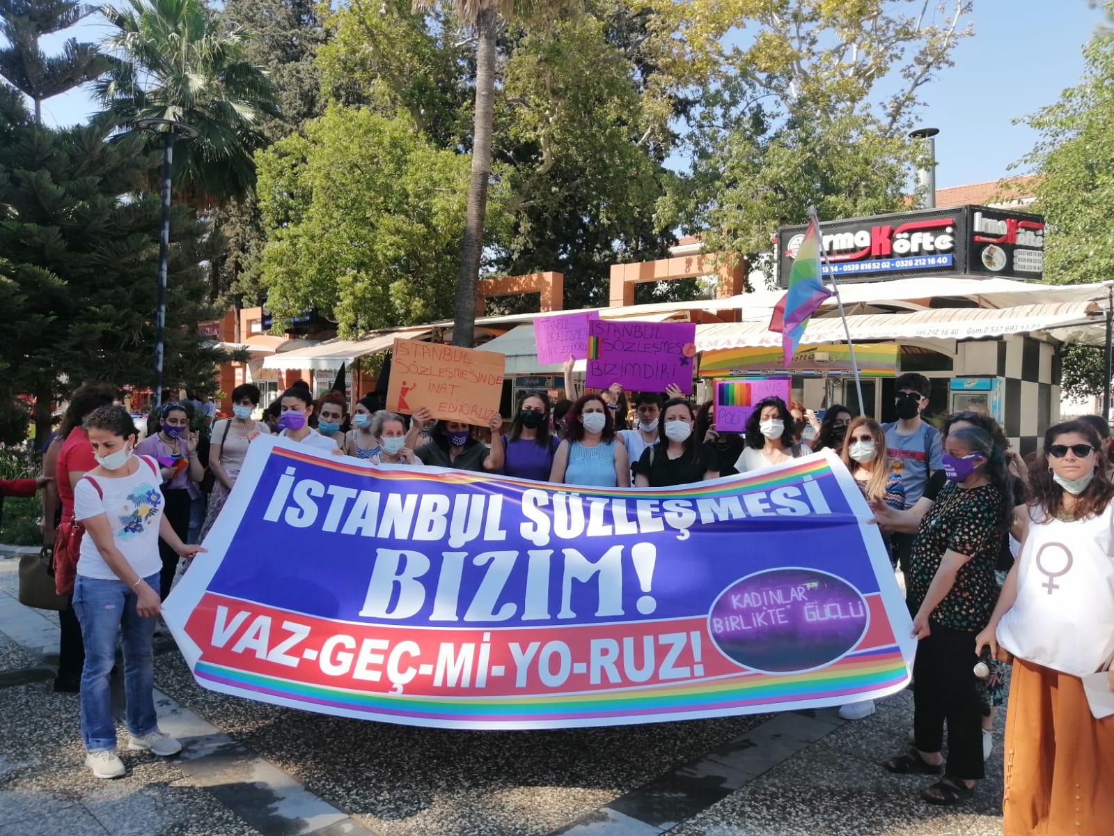 Hatay Kadınlar Birlikte Güçlü Platformu, İstanbul Sözleşmesi’ne sahip çıkmak için Antakya Atatürk Parkı’nda bir araya geldi. “İstanbul Sözleşmesi Bizim! Vazgeçmiyoruz!” pankartını taşıyan kadınlar, HDP’ye yapılan saldırıda Deniz Poyraz’ın katledilmesini de kınadı. Deniz Poyraz şahsında katledilen tüm kadınlar için bir dakikalık saygı duruşunda bulunuldu.