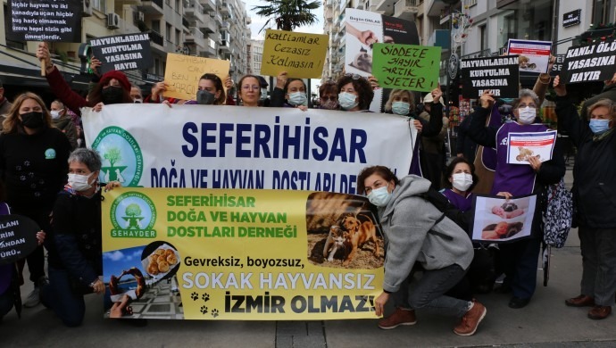 İzmir Konak Alsancak’ta bir araya gelen hayvan hakları savunucuları, AKP’li Cumhurbaşkanı Recep Tayyip Erdoğan’ın “Belediyeleri sahipsiz hayvanları sokaktan alacak adımları atmaya çağırıyorum” açıklamasının ardından sokakta yaşayan köpeklerin toplatılmasına tepki gösterdi.