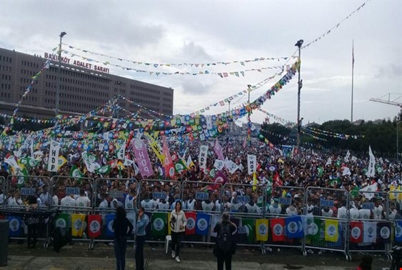 Halkların Demokratik Partisi’nin (HDP) ve ittifak güçlerinin, “Savaşsız, sömürüsüz yaşam için buluşuyoruz” sloganıyla gerçekleştirdiği büyük İstanbul mitingi için on binler Bakırköy Halk Pazarı’na akıyor. Sabah saatlerinde başlayan yoğun yağmura rağmen on binler, “Biji Serok Apo”, “ Selo’ya özgürlük”, “Hak hukuk adalet HDP’ ile gelecek” sloganları eşliğinde alana giriş yapıyor. Miting alanına 3 farklı noktadan giriş yapan on binler, iki polis aramasından geçiriliyor. Mitinge katılanların HDP’nin yanı sıra Türk bayrakları taşıması da dikkat çekiyor.