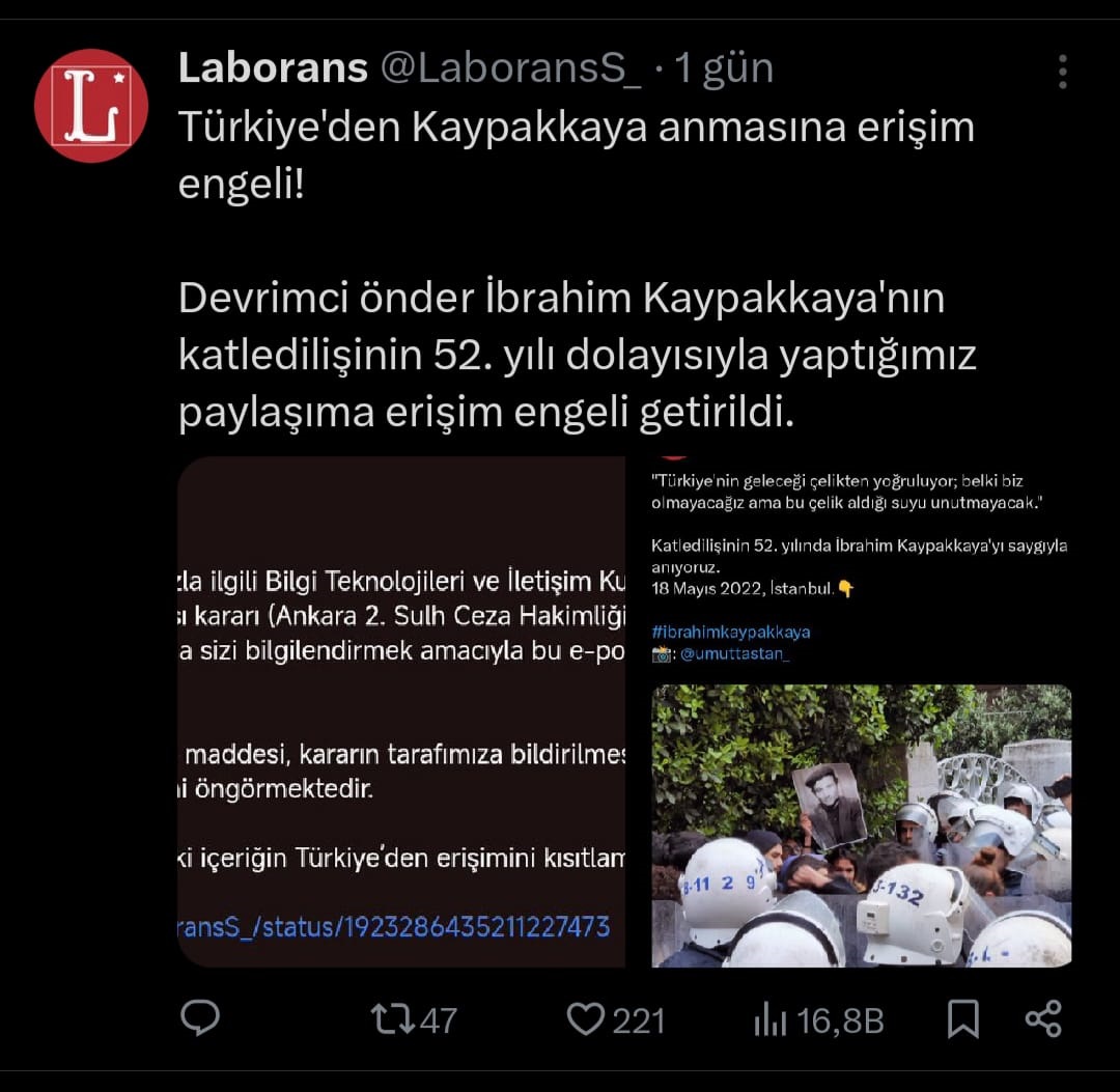Komünist önder İbrahim Kaypakkaya’nınkatledilişinin 52’nci yılı dolayısıyla yapılan sosyal medya paylaşımına erişim engeli getirildi. Kaypakkaya’nın katledilişinin 52. yılı dolayısıyla @LaboransS_ hesabından yapılan paylaşıma erişim yasağı kararı getirildi. @LaboransS_ hesabından yaptığı paylaşımda, kararın Ankara 2’inci Sulh Ceza Hakimliği tarafından alındığını duyurdu.