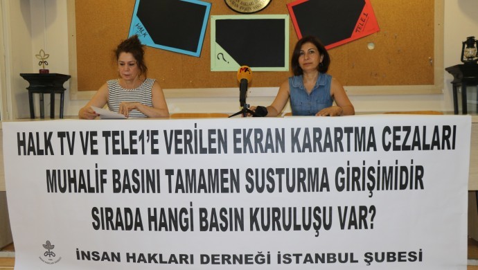 İnsan Hakları Derneği (İHD) İstanbul Şubesi, RTÜK tarafından Tele1 ve Halk TV’ye verilen 5 günlük ekran karartma cezasına ilişkin dernek binasında açıklama yaptı. Açıklamanın yapıldığı salona, “Halk Tv ve Tele1’e verilen ekran karartma cezaları muhalif basını tamamen susturma girişimidir. Sırada hangi basın kuruluşu var?” pankart ile karartılmış siyah dövizler asıldı.