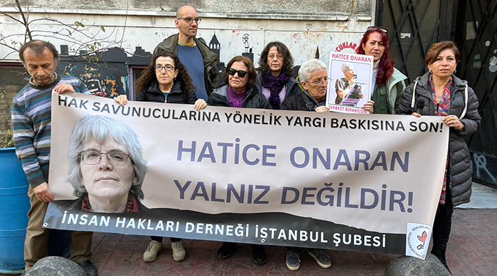 İnsan Hakları Derneği (İHD) İstanbul Şubesi Hapishane Komisyonu, tutsaklara para yatırdığı için “örgüte finans sağlamak” iddiasıyla tutuklanan üyeleri Hatice Onaran için Birleşmiş Milletler (BM) İnsan Hakları Komisyonu’na mektup gönderdi. Öncesinde şube binası önünde basın açıklaması yapıldı. “Hak savunucularına yönelik yargı baskısına son. Hatice Onaran yalnız değildir” pankartı açılan eylemde İHD Hapishane Komisyonu üyesi Meral Nergis Şahin açıklama yaptı.