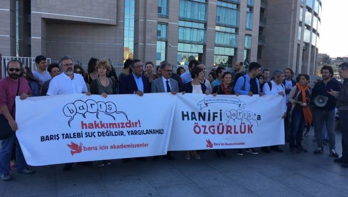 “Bu suça ortak olmayacağız” başlıklı bildiriye imza attıkları için haklarında dava açılan Barış Akademisyenlerinin yargılandığı davaların duruşmaları devam ediyor. 5 ayrı mahkemenin bakacağı duruşmalarda bugün 17 barış akademisyeni yargılanacak. 4 Temmuz 2018’den beri tutuklu bulunan akademisyen Hanifi Barış’ın da ilk duruşması bugün görülecek.