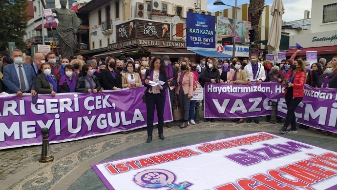 Açıklamada konuşan CHP Kepez Belediyesi Meclis Üyesi Avukat Nesibe Bahadır, İstanbul Sözleşmesi’nin uzun yıllardır sürdürülen kadın mücadelesi ve kazanımları ile hazırlandığını söyledi. Kadın mücadelesinin en önemli kazanımı olan sözleşmenin bir gecede yok edilebileceğinin sanılmasının büyük bir yanılgı olduğunu kaydeden Bahadır, “Bizler, Erdoğan’ın TBMM’yi ve hukuku yok sayarak aldığı İstanbul Sözleşmesi’nden çekilme kararını tanımıyoruz ve tanımayacağız” dedi.
