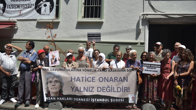 Dernek binası önünde yapılan açıklamada söz alan Meral Nergiz Şahin, “Haftalardır burada Hatice Onaran için eylem yapıyoruz. Eşi dahil durumu olmayan tutsaklara para yatırdığı için hukuksuz bir şekilde mahkum edildi Hatice. Biz bu durumu kabul etmediğimizi her hafta söylüyoruz. Tutsaklara para yatırmak suç değildir” diye vurguladı.