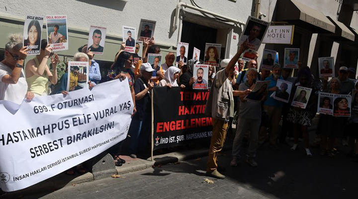 İnsan Hakları Derneği (İHD) İstanbul Şubesi Hapishane Komisyonu, her hafta düzenlediği “F Oturması” eyleminin 699’uncusunu dernek binası önünde gerçekleştirdi. Bu haftaki eylemde, Bakırköy Kadın Kapalı Hapishanesi’nde tutulan ağır hasta tutsak Elif Vural Yaş’ın sağlık durumuna dikkat çekildi. Açıklamayı İHD İstanbul Şubesi Hapishane Komisyonu Üyesi Mehmet Acettin okudu.