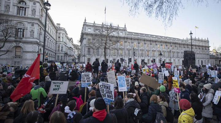 İngiltere Başbakanlık Ofisi “10 Numara”nın bulunduğu Downing Caddesi’ne doğru yürüyen yüzlerce kişi, greve giden Ulusal Sağlık Sistemi (NHS) çalışanlarına destek verdi.