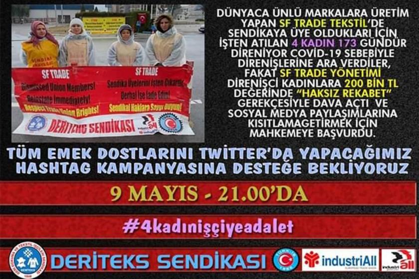 İzmir Gaziemir Organize sanayide yer alan ve uluslararası firmalara üretim yapan SF Trade fabrikasında, Deriteks Sendikasına üye oldukları için işten atılan işçilerin 170 gün süren direnişleri koronavirüs salgınıyla birlikte ara verilmişti. Bu süreçte SF Trade patronu ise işçilere ‘haksız rekabete yol açmak’ gerekçesi ile 200 bin TL’lik dava açmıştı. Ayrıca sosyal medyadaki paylaşımları dolayısıyla da şirketin engelleme talebinde bulunduğunun da bilgisini veren Deriteks İzmir Şube Başkanı Makum Alagöz, bu haksızlığa karşı mücadele çağrısı yaptı.