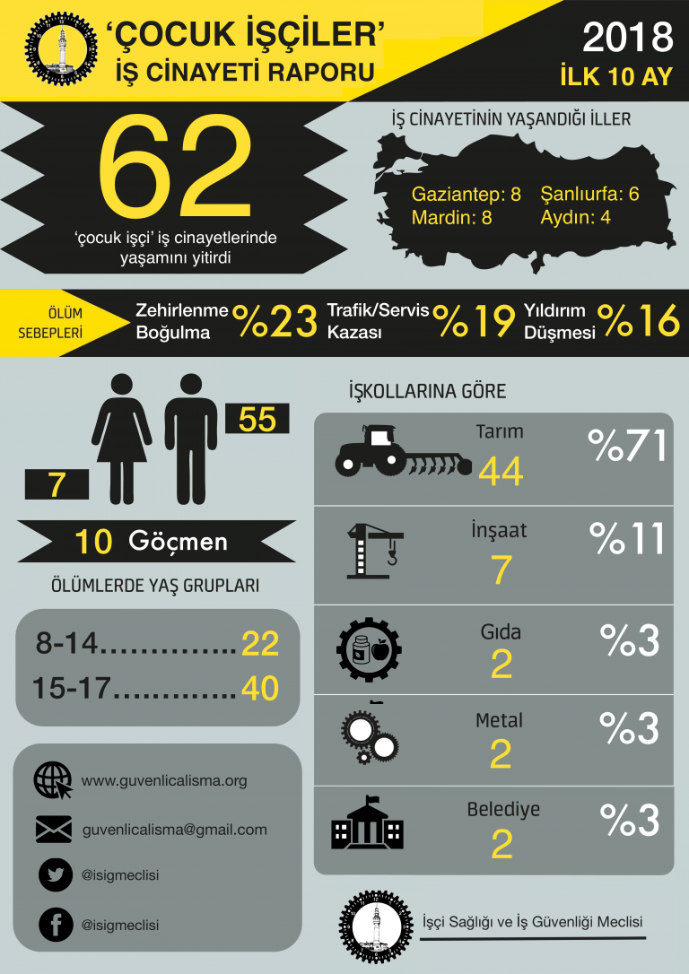 İktidarın çocuk işçiliğini denetlemekten kaçındığını belirten İSİG Meclisi, çocuk işçilerin iş yerlerinin “görünmeyen” özneleri olduğunu ifade etti. 2018 yılının ilk on ayında en az 62 çocuk işçinin iş cinayetlerinde yaşamını yitirdiğine dikkat çeken İSİG Meclisi’nin hazırladığı rapora göre;