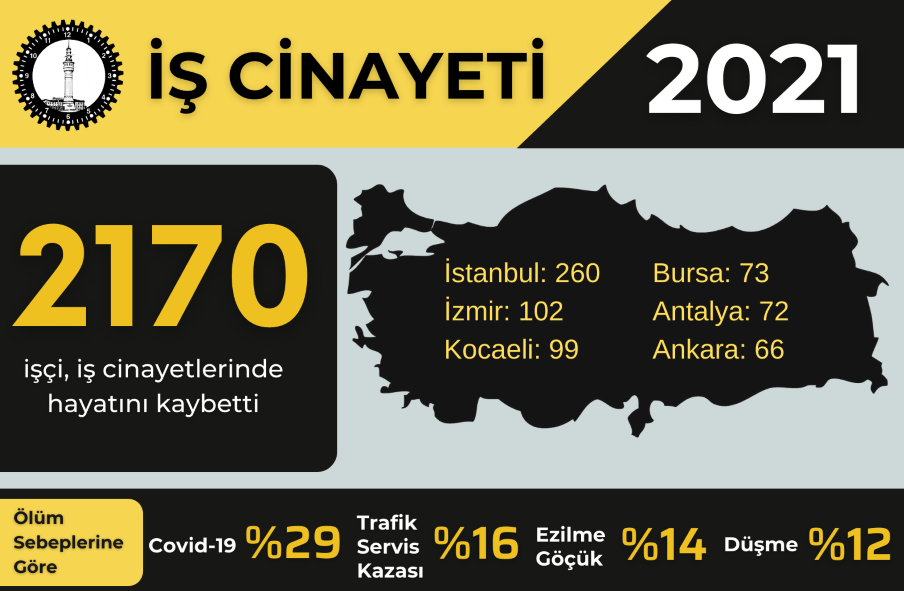 İşçi Sağlığı ve İş Güvenliği (İSİG) Meclisi, ‘2021 yılı İş Cinayetleri Ön Raporu’nu yayımladı. Raporda, “Yüzde 65’ini ulusal basından; yüzde 35’ini ise işçilerin mesai arkadaşları, aileleri, iş güvenliği uzmanları, işyeri hekimleri, sendikalar ve yerel basından öğrendiğimiz bilgilere dayanarak tespit ettiğimiz kadarıyla 2021 yılında en az 2170 işçi hayatını kaybetti…” ifadelerine yer verildi.