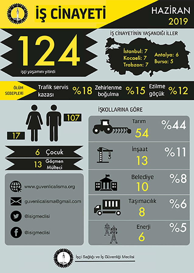 İşçi Sağlığı ve İş Güvenliği (İSİG) Meclisinin verilerine göre, haziran ayında en az 124 işçi iş cinayetinde hayatını kaybetti. Böylece 2019 yılının ilk 6 ayında en az 840 işçi çalışırken öldü.