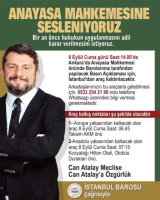 İstanbul Barosu, 9 Eylül’de AYM önünde Gezi tutuklusu TİP Milletvekili Can Atalay için basın açıklaması yapılacağını duyurdu.