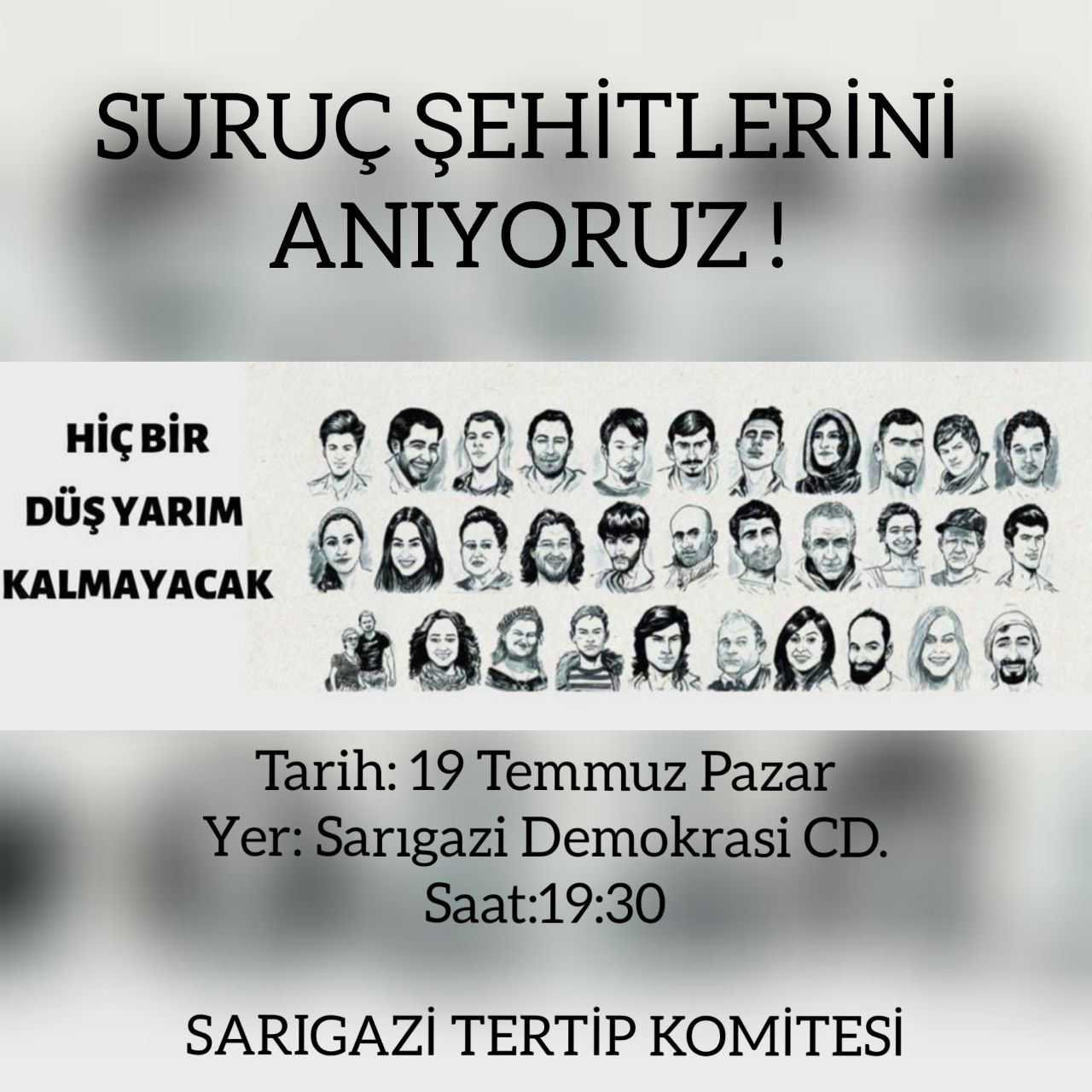19 Temmuz Pazar (Bugün) saat 19.30’da Sarıgazi Demokrasi Caddesi’nde Suruç anması gerçekleştirilecek.