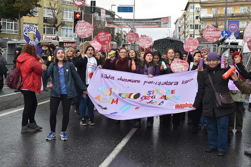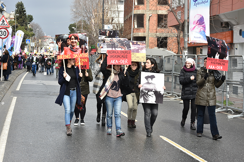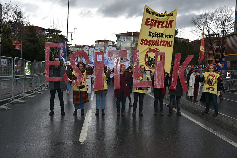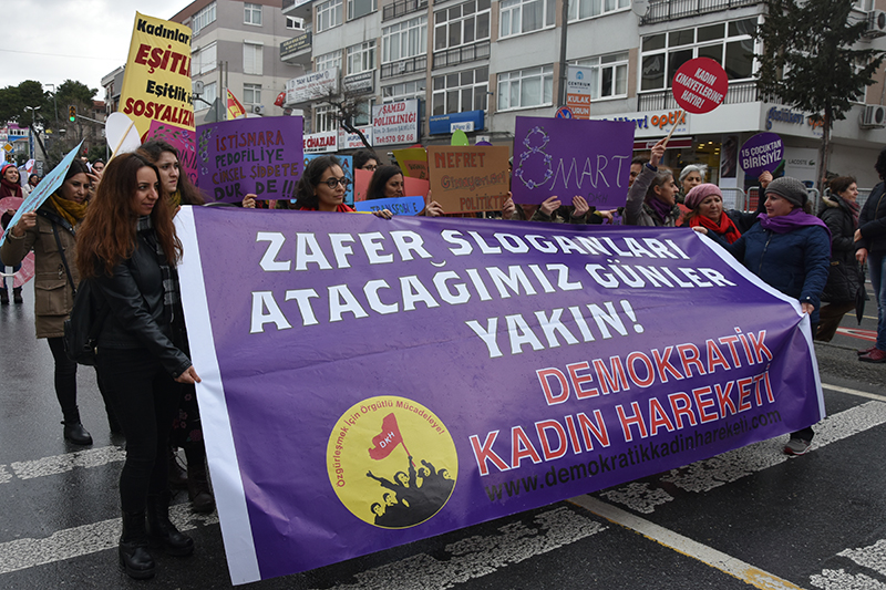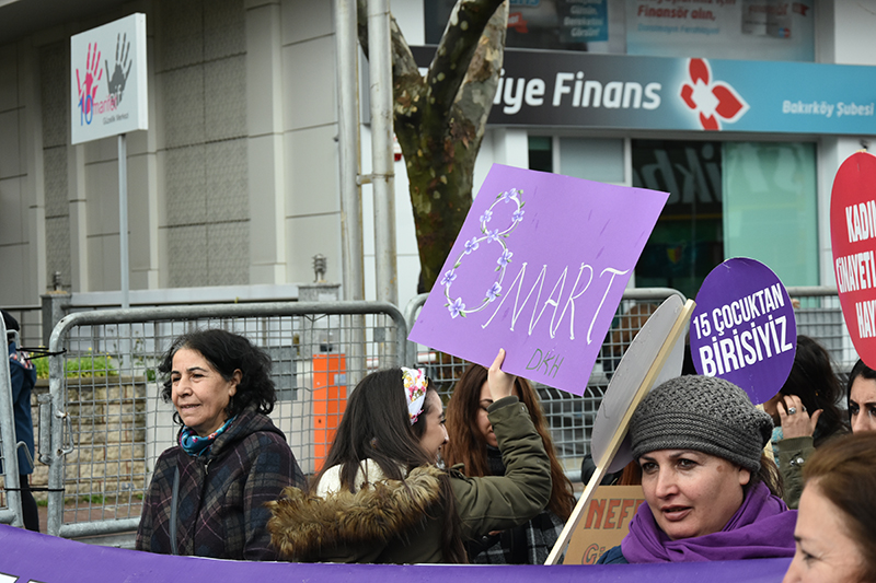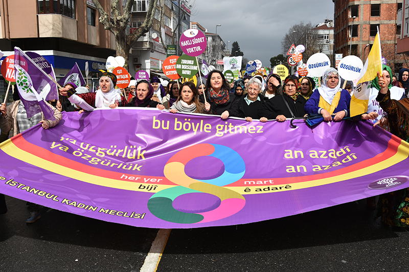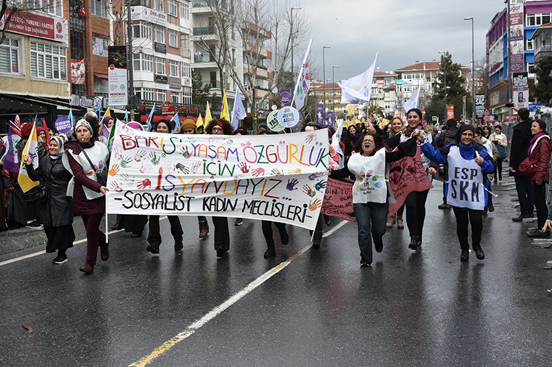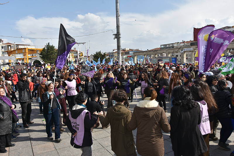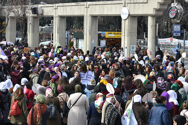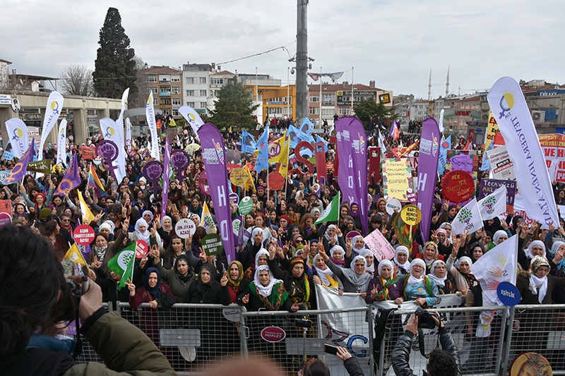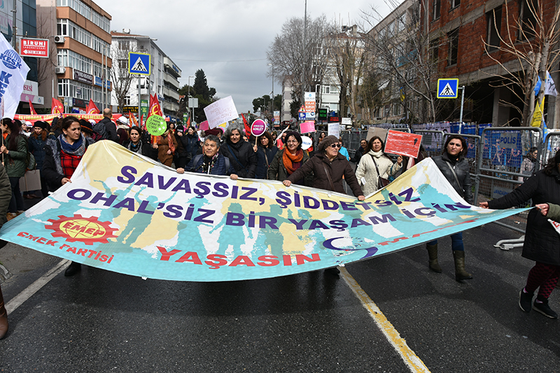 İstanbul’ da 8 Mart Kadın Platformu çağrısıyla “Savaşa, OHAL’e, cinsiyetçiliğe karşı emeğimiz, kimliğimiz ve özgürlüğümüz için direniyoruz” şiarıyla Bakırköy Özgürlük Meydanı’nda miting düzenlendi.