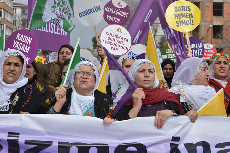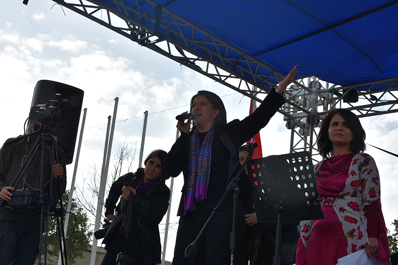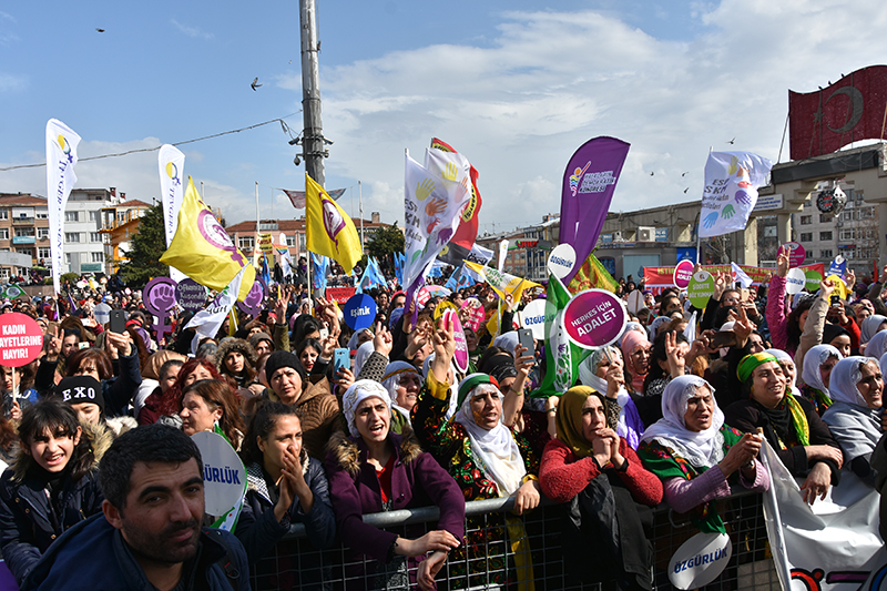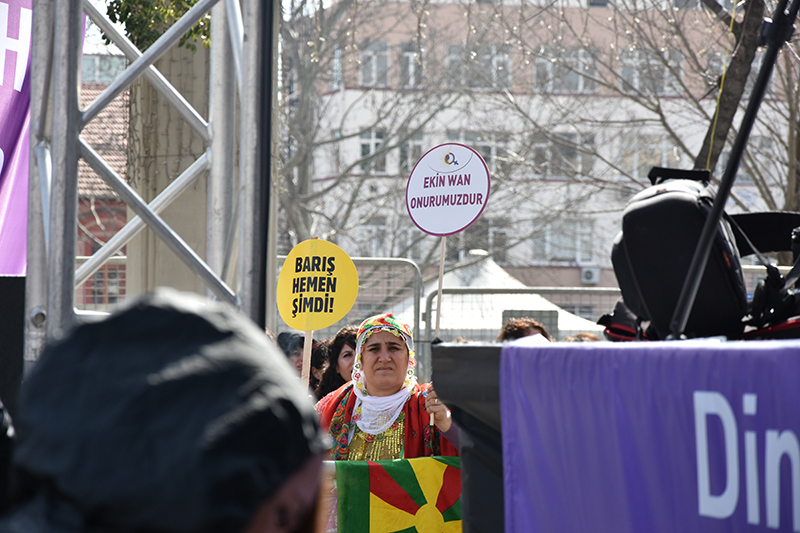 Son olarak ise sahneye çıkan Halkların Demokratik Partisi Eş Genel başkanı Pervin Buldan bir konuşma yaptı.”Bugün dünyanın dört bir yanında alanlarda olan, kendi özgürlüğü demokrasi ve barış için alana çıkan kadınlara sevgilerimizi gönderiyorum” dediği konuşmaya şöyle devam etti. Emekçi, işçi kadınlar yaşamın her alanında eşlerimize, kocalarımıza, abilerimize itaat etmiyoruz diyorlar. Sizin de emirlerinize biat etmiyoruz. Çünkü bu ülkeyi yönetenler kadınların iradesini yok sayıyor, kadınları siyasetin arkasına atmak istiyor” dedi.