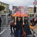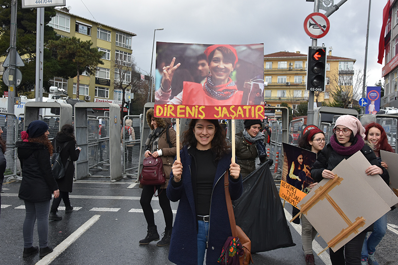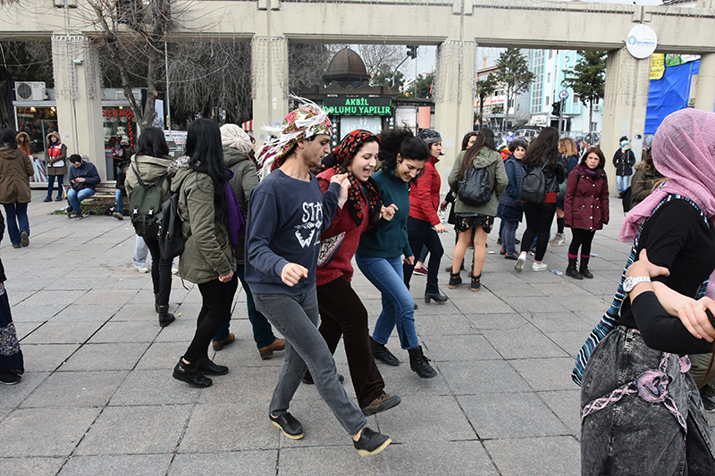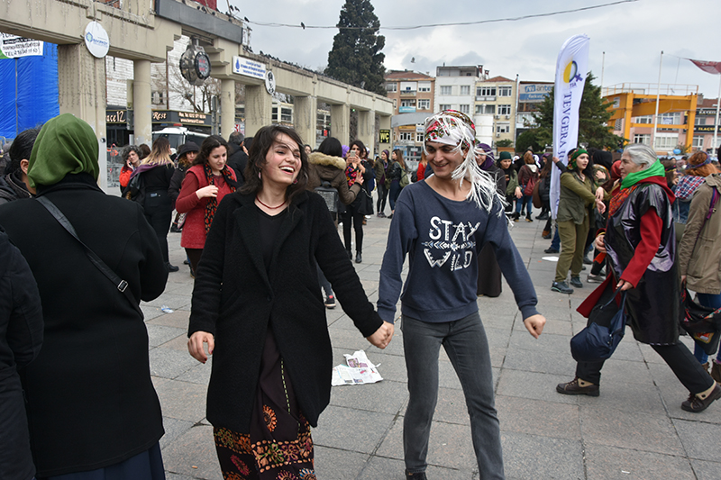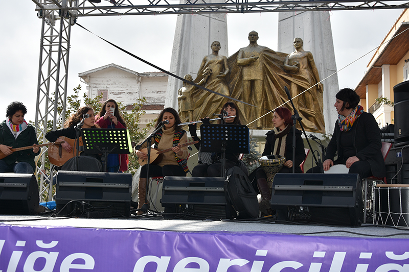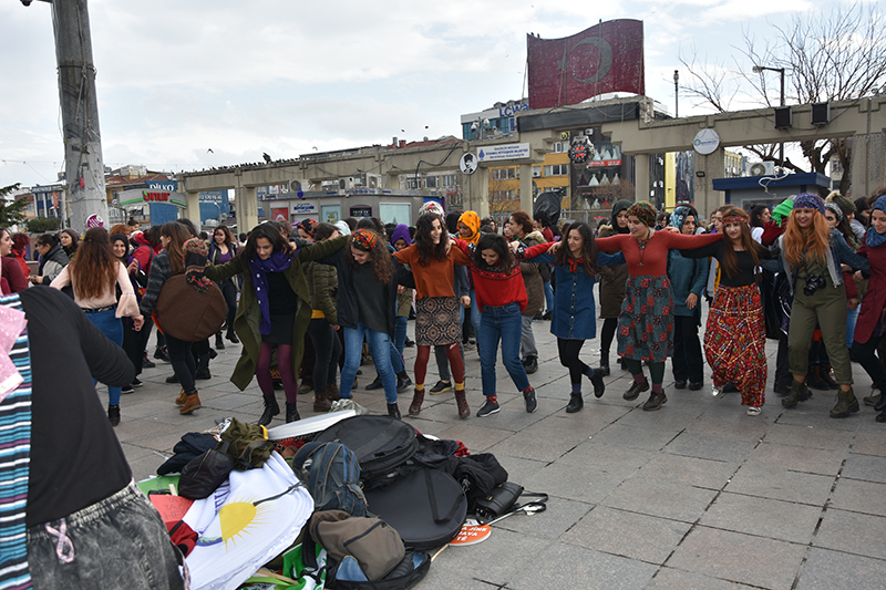 Dikili Taş’ta başlayan yürüyüşle alana giren kadınlar tarafından sık sık “Jın Jiyan Azadi, Dünya yerinden oynar, kadınlar özgür olsa, Efrin savaşına hayır” sloganları atıldı. Miting özgürlük ve devrim mücadelesinde yaşamını yitiren tüm insanlar için yapılan saygı duruşunun ardından başladı.