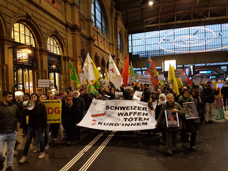 Eylemde istasyonda bulunan kalabalıktan konuşma yapan bir kişi, İsviçre ve Türkiye arasındaki ekonomik işbirliğinin sürdüğü ve Kürdistan’a karşı yürütülen kirli savaşta İsviçre devletinin de rolünün bulunduğunu söyledi.